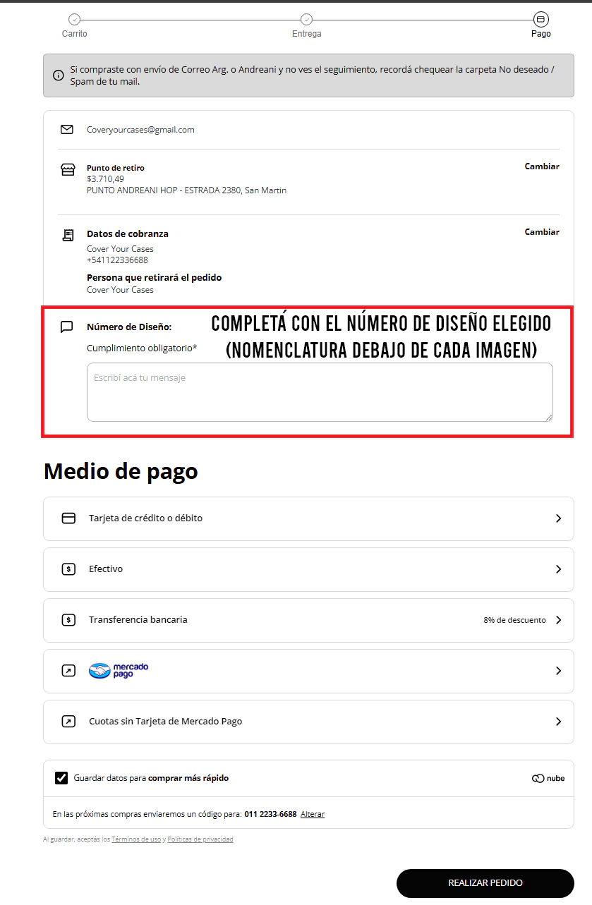 Antes de iniciar el proceso de pago, podrás escribir el diseño que deseas.